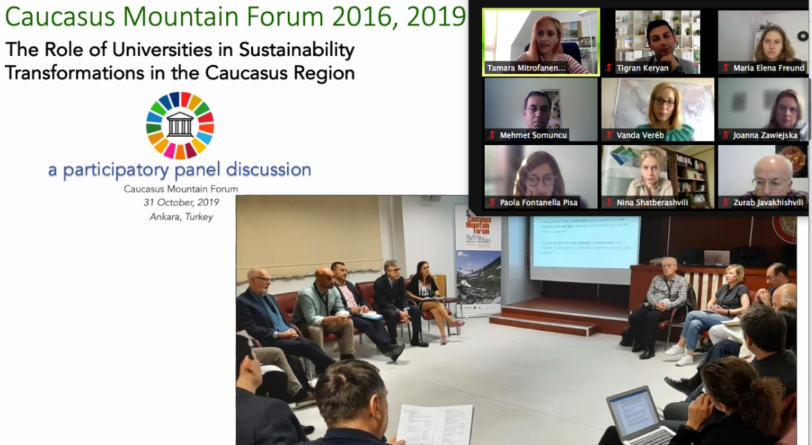 Representatives of both networks provided the background and facilitated the discussions on the following questions: to what extent do universities located in these regions and the members of these networks play a role in sustainable development processes? What are the challenges and opportunities in this respect in the Carpathians and the Caucasus societies? How can regional scientific networks support a stronger role of scientists and enhance the co-creation of knowledge among science, non-academic actors, and policymakers in these regions?