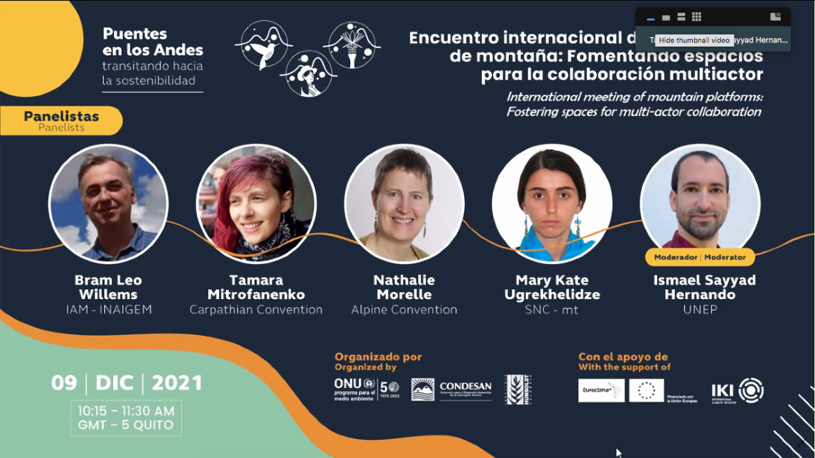 On December 9th virtual meeting of international mountain platforms: fostering spaces for multi-actor collaboration took place with the participation of the representatives of the Carpathian Convention, Scientific Network for Caucasus Mountain Region (SNC-mt), UNEP, Alpine Convention, and National Institute for Glacier and Mountain Ecosystem research (INAIGEM).
