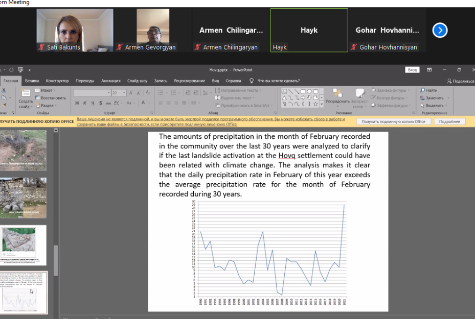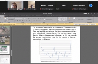 NIG Co-Chair Hayk Igityan presented the results of drone extraction and 3-dimensional modeling of the Hovk community-activated landslide. He also substantiated landslide triggers, their connection with factors driven by Climate Change, due to exceeding the norm of one-time precipitation of many times.