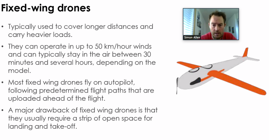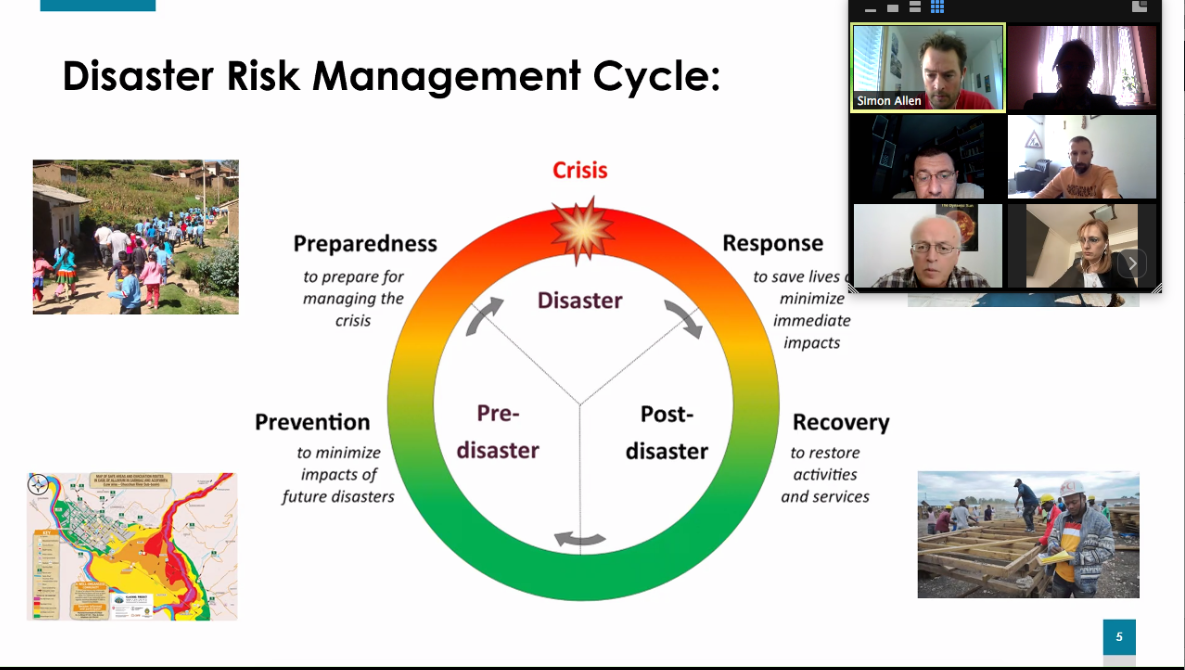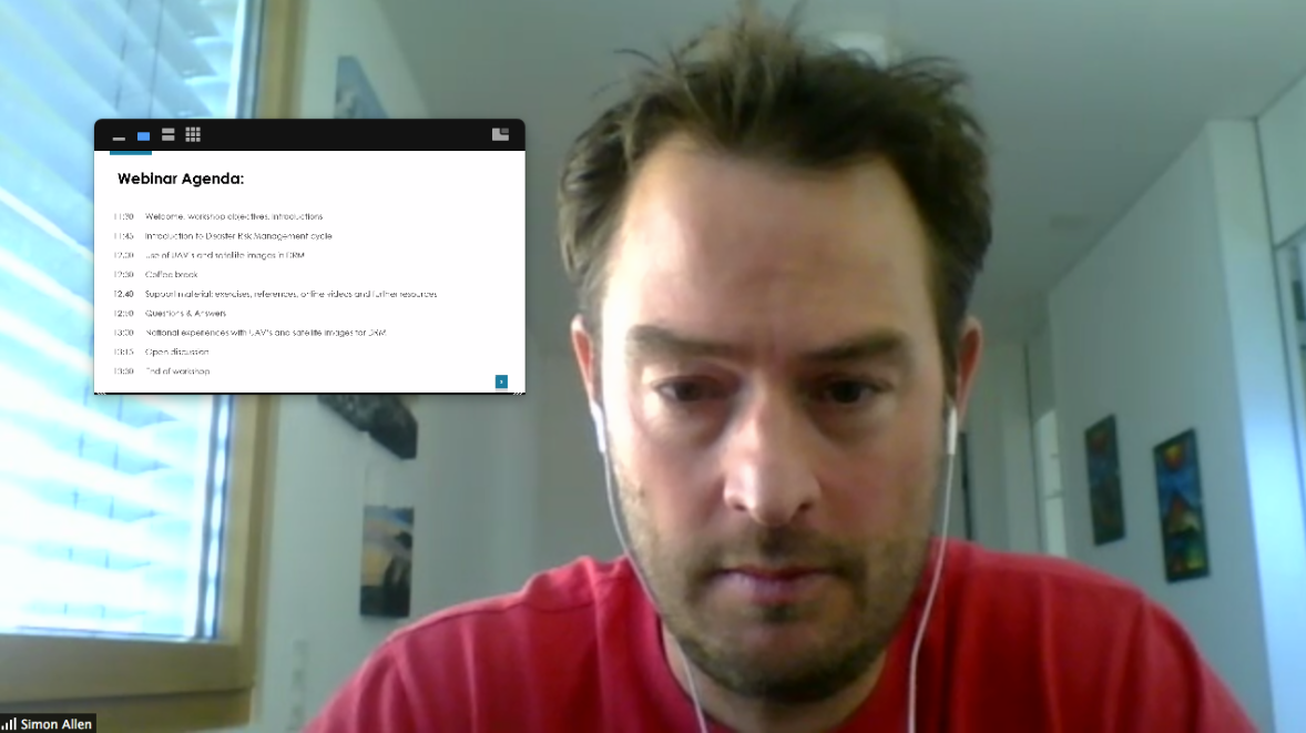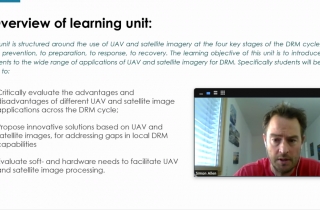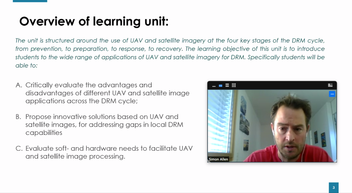 The webinar was led by Simon Allen, from the University of Geneva. The learning objective of the aforementioned unit aims to introduce students to the wide range of applications of UAV and satellite imagery for DRM. Specifically, students will be able to: